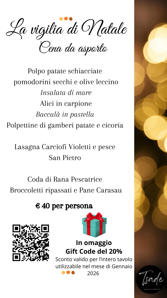 Ordina la tua cena della Vigilia e Tsade ti omaggia con un Gift Code del 20% da utilizzare per l’intero tavolo nel mese di Gennaio 2026.